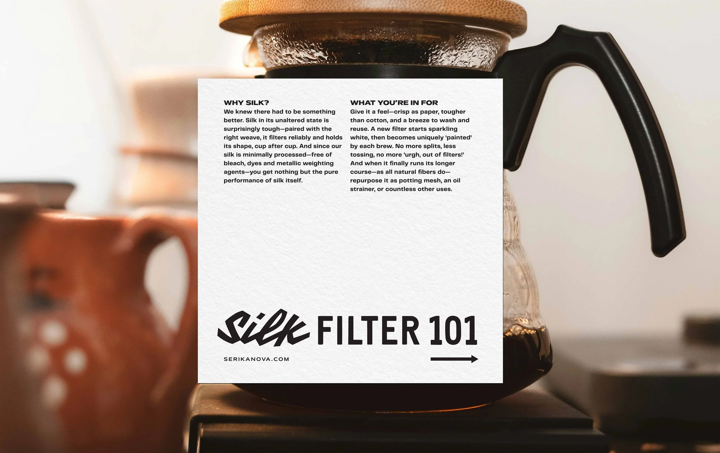 Serika Nova is a modern materials brand and the home of the world’s first silk coffee filter—its flagship product and the starting point of a larger mission to reimagine how silk lives in everyday life.